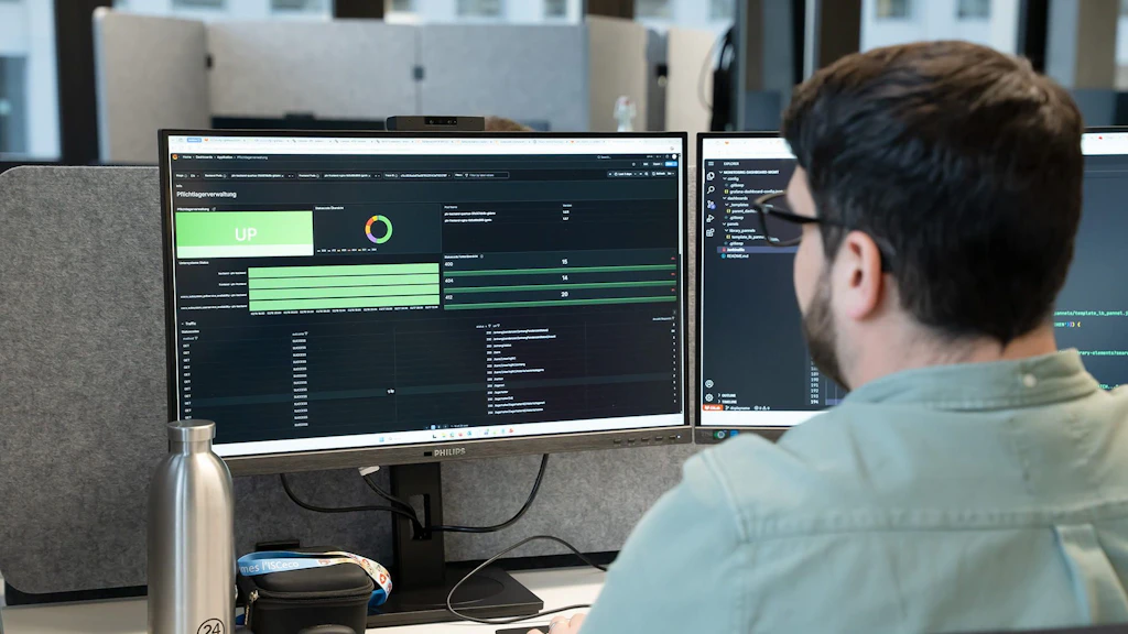 Basierend auf den Cloud native Tools haben wir eine eigene Monitoring-Oberfläche entwickelt. In dieser Oberfläche gibt es ein zentrales Dashboard, das den Status unsere zahlreichen Fachanwendungen mit roten und grünen Indikatoren übersichtlich darstellt. So sehen wir auf einen Blick, wo Handlungsbedarf besteht.